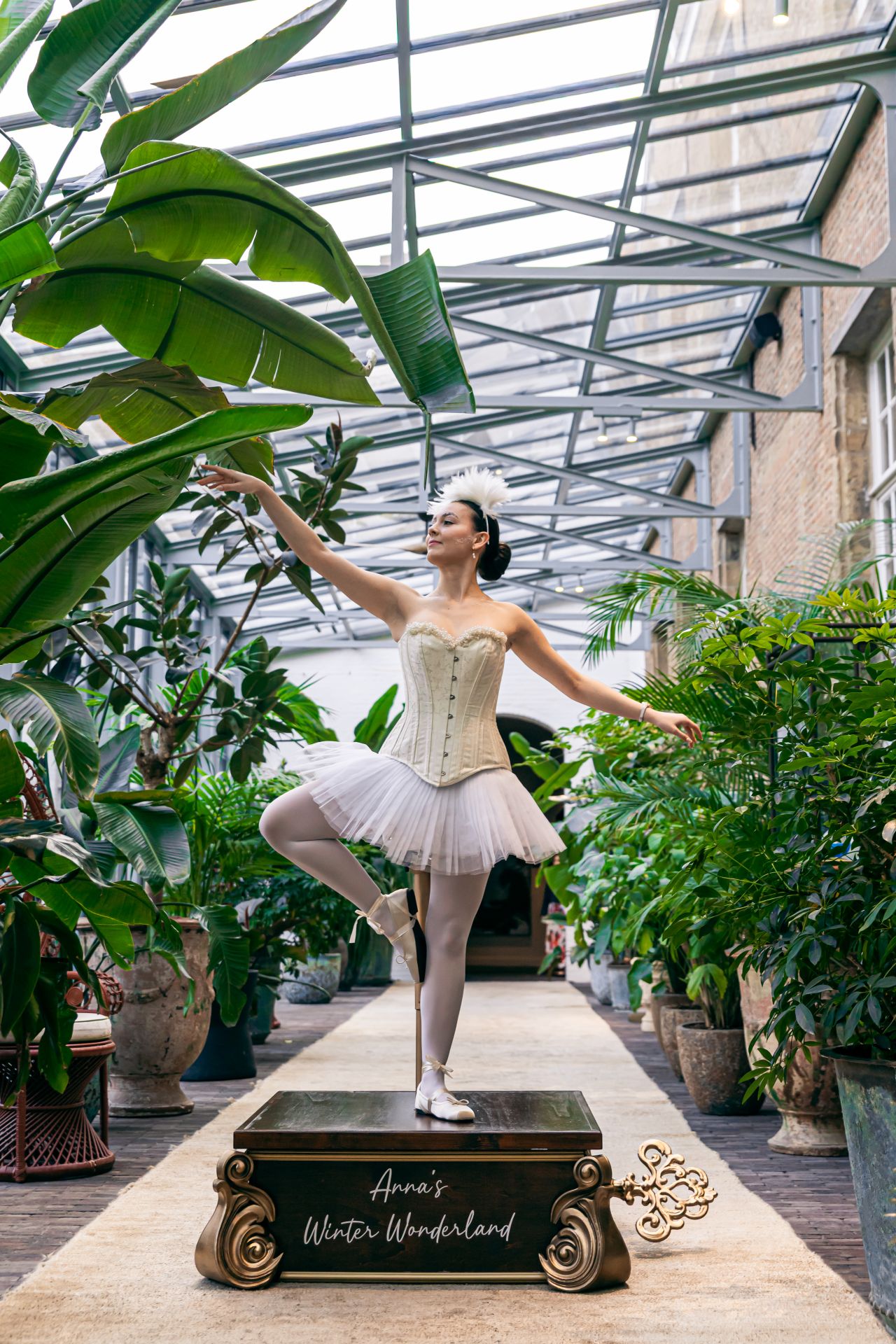 De combinatie van elegante witte ballerina's met een klassiek muziekdoosje creëert een stijlvolle en unieke eyecatcher. Het muziekdoosje is volledig personaliseerbaar, waardoor elke performance perfect aansluit bij de sfeer en identiteit van jouw event.
